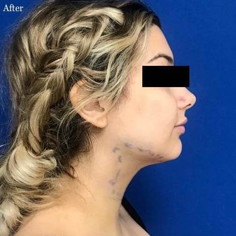 This young patient always had a double chin, which can be a problem area for many people. To address it, she had a high definition neck liposculpting procedure that removes fat and tightens the neck skin. RESULTS shown are only AFTER 24 HOURS post surgery, and you can already see the transformation, even with the swelling being present. The markings also represent that the entire neck and chin area are worked on with this procedure. Patient’s overall facial features became much more defined, especially the well-defined jawline and the chin area. She now has a smooth (almost 90-degree angle) transition from her chin to her neck.